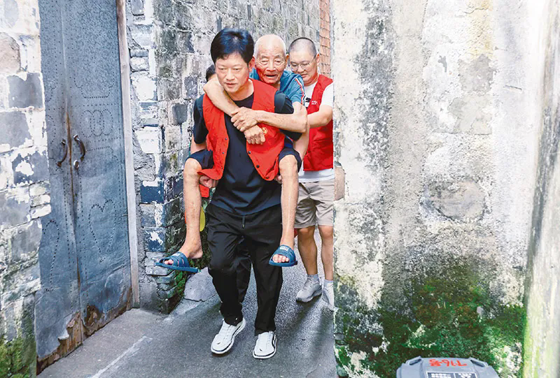 新时期以来,庞杂党员干部属目走好新时期各人门道,不断把我们党密切磋磨各人的优良魄力施展光大。图为2024年9月19日,台风“普拉桑”靠拢我国华东沿海,浙江省诸暨市赵家镇泉畈村村干部和党员志愿者在台风莅临前更动老旧房里的老东谈主。新华社记者 徐昱/摄